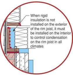 Rim joist insulation - Fiberglass cavity insulation at the rim joist is only acceptable if the exterior sheathing is cavity-warming rigid foam insulation that extends down over the entire rim joist. If non-insulating exterior sheathing is used at the rim joist then one of the following insulation details must be used at the rim joist (see Figure 7a) to manage condensation potential: