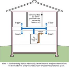 - Ducting - Single return requires transfer grilles to provide path and avoid pressurizing bedrooms as shown in Figures 3a-d.