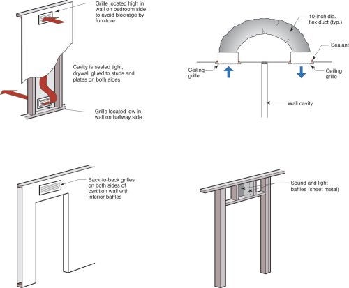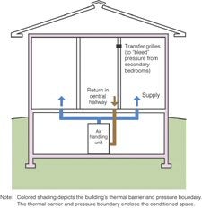 - Ducting - Single return requires transfer grilles to provide path and avoid pressurizing bedrooms as shown in Figures 19a-d.