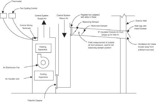 - Intermittent central-fan-integrated supply, designed to ASHRAE 62.2 rate, with fan cycling control set to operate the central air handler as much as 33% of the time, but not less than 25% of the time, occurring within at least every three hours to provide ventilation air distribution and whole-house averaging of air quality and comfort conditions ($125 to $150). Optionally include a normally closed motorized damper in the outside air duct with the AirCycler® FRV control (+$50 to $60). Optional dehumidification separate from cooling (+$300 to $350). See Figures 20, 21 and 22.