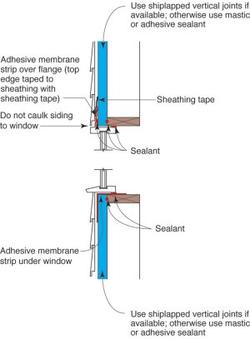 Flashing details – Since the vinyl siding is a screened wall cladding system, flashing details should be accomplished in the plane of drainage (building paper or house wrap), not the cladding. Do not caulk siding and do not rely on "J"-channel as part of the drainage plane. (In other words, never consider vinyl siding, aluminum siding or any siding, for that matter--as the weather barrier).