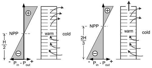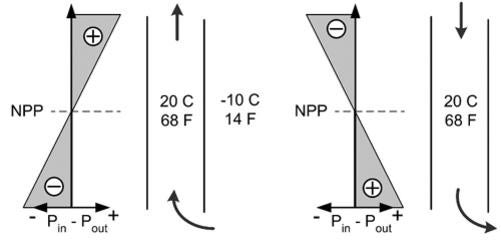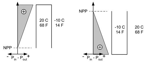 For example, if the air in a one meter high cylinder, open at the bottom and containing room temperature air (20 °C) is taken into the outdoors at a temperature of -10 °C, an outward pressure of 1.34 Pa would act at the top (Figure 3). The pressure at the bottom must be zero since it is connected to the outdoors. The horizontal plane at which the pressure equals the outdoor pressure (i.e. the difference is zero) is called the Neutral Pressure Plane (NPP).