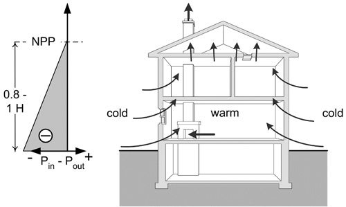 Although houses tend to be only 3 to 9 m (9 to 27 feet) tall, stack effect can be a major force driving airflow, particularly in climates with a large temperature difference (more than 25 °C / 40 °F) across the enclosure. Often the exhaust of chimneys and fans, as well as leaky ceiling planes result in a Neutral Pressure Plane located near the ceiling level (Figure 6).