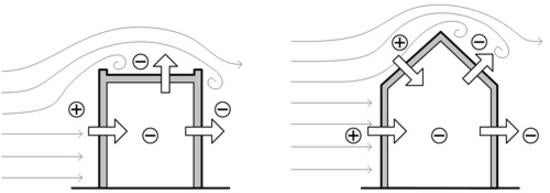 Low-slope roofs tend to have mostly negative (uplift) pressures, especially on the leading edge (Figure 2). Roofs with slopes above about 25 degrees experience positive pressures on the windward face, and suctions on the leeward.