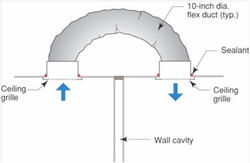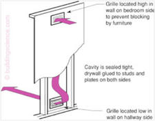 The solution to this problem is to provide pressure relief between the bedroom and hallway either with through-wall transfer grilles or jump ducts through the attic.1 Transfer grilles are preferred to keep the air movement inside the conditioned space in the case of ventilated attics. Ducts should be sized to maintain less than a 3Pa pressure difference across a closed door.2