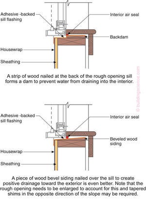 A block of wood nailed at the back of the rough opening sill can be used with membranes to create a back dam. Similarly, beveled siding can be nailed at the bottom of the rough opening to create a positive slope under the membrane. The back dams of manufactured pan flashing and sheet metal pan flashing must be protected against bending and breakage during window installation.