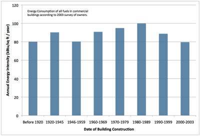 Figure 3: Actual Measured Energy Consumption versus Year Constructed for US Commercial Buildings (data from DOE Energy Information Agency CBECS 2003 Survey)