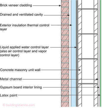 Figure 1: Institutional Wall – Combined water control layer, air control layer and vapor control layer in single material. The thermal control layer is located exterior to the other control layers.