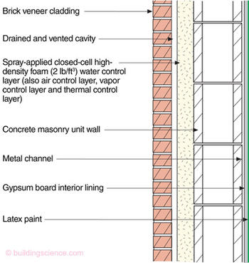 For example a liquid applied water control layer can also be the assembly air control layer and vapor control layer (Figure 1). In some assemblies closed cell high-density (2 lb/ft3) spray polyurethane foam can be the assembly water control layer, air control layer, vapor control layer and also thermal control layer (Figure 2).