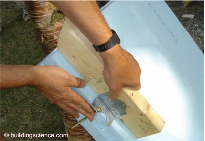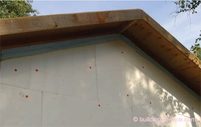 Photograph 3: Ventilation Rafter—The 2x4 (standing proud) is connected through the roof rigid insulation with a metal bracket and a long roofing screw. You can purchase 14 in. (356 mm) long epoxy-coated steel screws. Stay away from stainless steel screws because the heads twist off. Stainless steel tends to be soft. Ask me how I know.