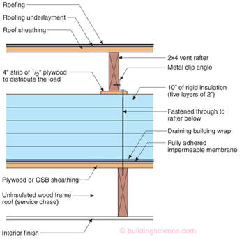 Figure 2: Roof Section—The vent rafters are connected through the roof rigid insulation with a metal bracket and a long roofing screw. Note the 4 in. (100 mm) strip of plywood under the rafter to distribute the load due to the limited compressive strength of the rigid insulation.