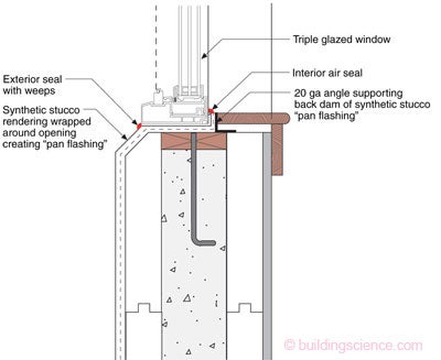 Another annoying issue is the water management of “punched openings” such as windows. There are only two kinds of windows in the world–those that leak and those that will leak. So what to do? Easy, wrap the water control layer around the window opening creating an under window “gutter” (Figure 6). In most cases the water control layer is a synthetic stucco rendering. It can also be a “liquid applied flashing system” that is then integrated with the exterior layer on the ICF’s. With back ventilated and back drained exterior claddings attached to the ICF’s with furring strips no additional water management on the exterior face of the foam blocks is necessary, as mentioned earlier. However, this does not apply to the punch openings in such assemblies. The punched openings need to be lined with a liquid applied flashing system to get rainwater out to the exterior face of the foam ICF’s. Punched openings in all ICF assemblies regardless of cladding system need to be lined.