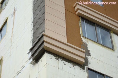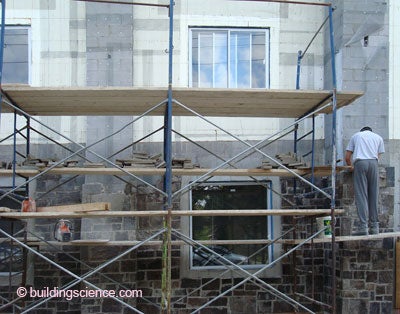 The water control layer is typically the rendering applied to the exterior face of the ICF. Think of a mass wall with no water sensitive elements. Incidental leakage through the exterior rendering is stored and dissipated in the foam and concrete layers of the remainder of the assembly. Drying happens in both directions.5 Claddings that do not require renderings are attached to the exterior of the foam blocks with furring strips. The back ventilation and back drainage of these types of claddings limit the water load on the exterior face of the foam blocks such that no treatment of the exterior face of the foam blocks is necessary. The joints in the foam blocks with respect to rain penetration can be ignored.