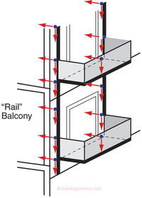 It gets better. Clip-on balconies, French balconies, rail balconies (Figure 2) and other structural innovations have seemingly banished the typical thermal bridging associated with multistory concrete frame apartment construction.3 Harley Davidson architecture is dead (see “BSI-005: A Bridge Too Far”).