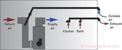 Figure 4: Distributed Ventilation—Individual unit ventilation is provided across exterior walls not across interior pressure boundaries such as floors. Outside air is supplied to unit air handlers. A motorized damper is installed in line with an outside air duct connected to return side of air handler. A programmable thermostat or other controller controls the damper and air handler. Occupant controls the kitchen and bath fans intermittently.