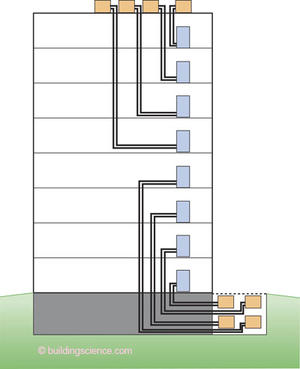 When ICF’s are used in apartment construction with internal compartmentalization (Figure 3), distributed ventilation systems (Figure 4) and distributed conditioning systems (Figure 5) the energy performance is nothing short of extraordinary (see “BSD-110: HVAC in Multifamily Buildings”). The only possible thing that can screw up the performance is over ventilation.4