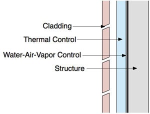 What is needed is a re-evaluation of how we assemble enclosures, and improvements in ensuring continuity of the control functions. As we change the insulation levels, airtightness, and materials, we need to consider changes in how materials are assembled in enclosures. The steel-stud framed walls of the 80’s and 90’s cannot continue to be built in the same manner in the 2010’s and 2020’s. It is now clear that such walls did not provide continuous thermal control. Better rain control is a critical part of the needed change, as are increases in tightness, better control of thermal bridging, and a protection of moisture-sensitive materials from extreme temperatures and prolonged wetting. The “perfect wall” approach (Figure 1) described above provides all of these improvements. Once thought of as an ideal enclosure assembly that would rarely be built, it is becoming the new standard for durable, energy-efficient, high-performance enclosures.