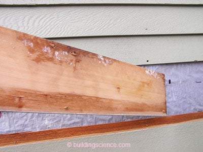 Photograph 3 - Wet Siding: Water that used to drain and not be absorbed now passes through the field of the building paper and is absorbed. More water is now retained for a longer period of time.