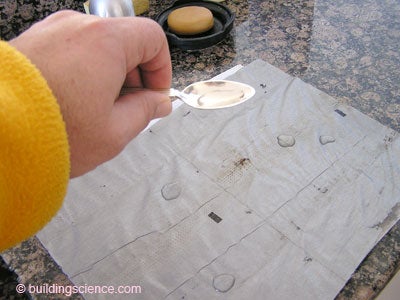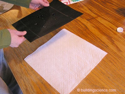 Photograph 4 - Tar Paper Test: A teaspoon of water is placed on tar paper placed over a paper towel. Look at how the water beads up on the surface. A beautiful sight.