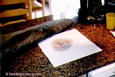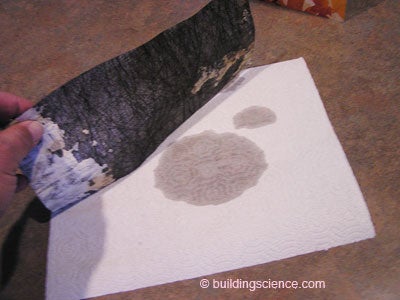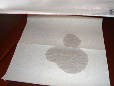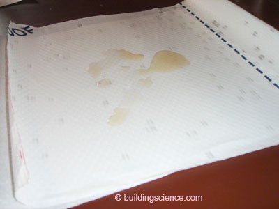 I began to notice that when I held failed housewraps up to the light they were darker in some spots than others. They would fail Joe Test 1 in the dark areas and pass Joe Test 1 in the non-dark areas. It became very obvious with lighter colored housewraps (Photograph 10). What caused the discoloration? That part was easy. Wood sugars and tannins. Water-soluble extractives. “Weak” surfactants by another name. This lead to Joe Test 3 and Joe Test 4.