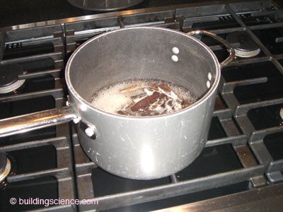 Both Joe Test 3 and Joe Test 4 involve boiling water. So this should not be done at home without adult supervision. Take a half dozen cedar chips (“mulch”) and boil in water for 30 minutes and allow to cool to room temperature (Photograph 11). Go have a beer while you wait. Then use a teaspoon to drop this weak surfactant solution on the sample (Photograph 12). This is Joe Test 3. Failure is pretty dramatic when it happens (Photograph 13). It should fail in less than 60 minutes if it is going to fail.