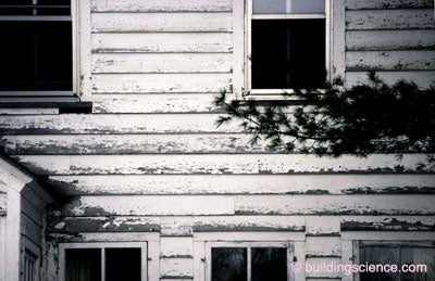 Photograph 1: Painted Wood Siding—Wood claddings move more on the south and west side because they go through greater temperature differences which lead to greater relative humidity differences which lead to greater moisture content differences. The biggest stresses on the paint films also happen on the orientations where they get the most brittle. Paint tends to fail on south and west orientations more because of greater solar exposure and greater substrate movement. Notice that the bottom edges loose the paint first. Old guys noticed this as well hence the practice of back priming at the overlaps. This is old siding with old paint – the non elastic non vapor permeable stuff – alkyd paint. Modern paints don’t do this. Having said that, it is still a good idea to back prime wood siding and back ventilate it by installing it over furring even when using the new stuff.