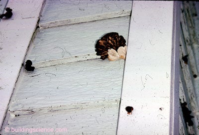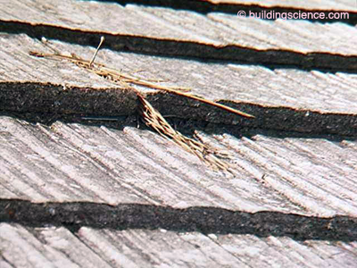 Photograph 6: The “Wolfgang Puck” Effect—Yes, those are mushrooms growing out of OSB siding made in the 1990’s – they might even be edible. Notice the thickening at the bottom edges of the boards at the overlap causing the paint film to fracture allowing even more water uptake via capillarity at the bottom edges.