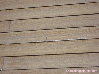 Photograph 7: Brittle Fiber Cement Siding—Fly ash added to fiber cement makes the stuff brittle and it tends to crack. The Tinkertoy sticks end up looking like spaghetti – but a stiff brittle spaghetti. This is not a good thing if you nail it and it sees winter.