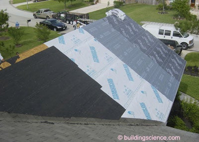 Photograph 3—Permeable and Impermeable Roofing Underlayments: Turned out that there was no measurable effect of roofing underlayment permeability on inward moisture drive through the roofing assembly.