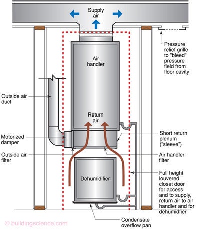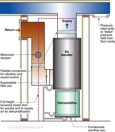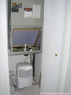 Figure 3: Dehumidifier in Return Closet—Standard off-the-shelf dehumidifier inside a return closet. Works great. Folks hate this because the return is not ducted. Not a rational objection in my view, but what do I know?