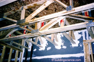 Photograph 1: Compartmentalization Air Sealing—Gypsum board is run up to the underside of the floor sheathing above and sealed with joint compound.