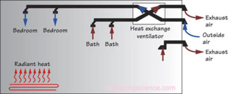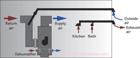 Figure 2: Fully Ducted HRV or ERV—The “Porsche” of ventilation systems. Only slightly less expense than a Porsche …. and certainly not as much fun. Kitchen exhaust is vented separately – not through the HRV or ERV. I prefer not to run the bathroom exhaust through them either, but I am in the minority.