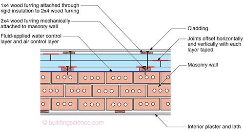 Figure 1: Perfect Wall Retrofit— Coat the exterior of the masonry with a fluid applied water control layer and air control layer. Install rather robust wood furring (2x4’s “on the flat”) directly to the masonry. Then insulate over the entire assembly with rigid insulation and install additional furring for cladding attachment. Finish the entire thing off with new cladding.