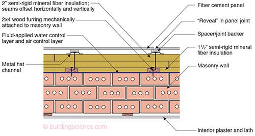 We got real help from everyone on this issue…manufacturers included. All of the walls passed the “don’t burn” “smell test.” The rigid foams all have a flame-spread index of 25 or less, and a smoke-developed index of 450 or less, and they are sandwiched between masonry and non-combustible claddings. If you want to go “all out,” use mineral fiber insulation and metal hat channels (Figure 2). Fluffy rocks covered with cement board held in place with steel anchors and metal channels installed over a masonry wall will please even the most persnickety Chicago fireman.