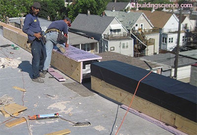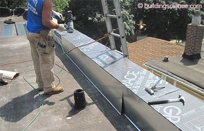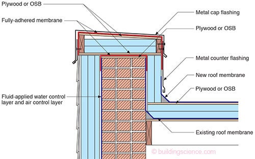 The jumbo-sized buildings have their own special problems…which we have all learned to call opportunities. Parapets and existing flat roofs that intersect the parapets provide interesting opportunities. You need to wrap the parapet with insulation—or get rid of it. I always make the “get rid of it” argument first. There is no good reason to have one anymore (BSI-050: Parapets—Where Roofs Meet Walls). Good luck with the “getting rid of it” argument. Folks seem to have an unnatural attraction to their parapets. Whatever. When you wrap the darn thing, it is a really good idea to insulate over the top of the existing roof and add a new membrane (Figure 3). And don’t forget to slope the parapet cap to the interior. And don’t forget the drip edges. And don’t forget the counter flashing. And don’t forget the air control layer continuity (Photograph 5 and Photograph 6).