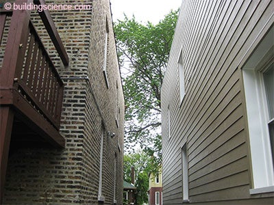 Photograph 4: Set Back” Issue—We are adding several inches to the outside of buildings and intruding on lot lines. Nobody misses the 6 inches between these two houses. Bylaws are going to have to be “massaged.” I thought I would never say this, but New York City has got it on the ball and does not count the exterior insulation in the “set back” dimension.