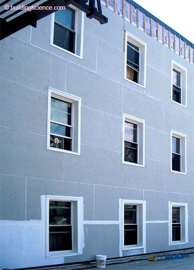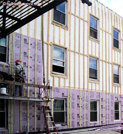 With the jumbo-sized buildings, you just start on one side and work your way around. First the fluid applied water control layer, and air control layer, and the 2x4 wood furring (Photograph 7). Then you layer in the rigid insulation (Photograph 8). Then the cladding. In this case, fiber cement panels (Photograph 9, Photograph 10 and Photograph 11).