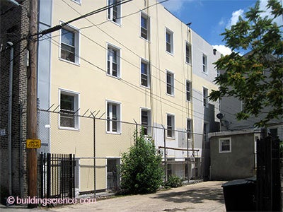 Believe it or not, the biggest code issue is a “set back” issue. When we do this retrofit, we are adding several inches to the outside of buildings and intruding on lot lines. The good news is that common sense wins the day. Giving up a couple inches to get a building or a house or a duplex a new lease on life—a comfortable energy efficient lease on life—is not a difficult sell…if the right calls to the right people are made at the right time…check out Photograph 4. Nobody misses the 6 inches between these two houses. This issue is going to come up again and again and again. Bylaws are going to have to be “massaged.” I thought I would never say this, but New York City has got it on the ball and does not count the exterior insulation in the “set back” dimension.5