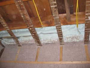Roof Assembly: Rafter-framed unvented attic with R-56 roof insulation: unfaced fiberglass batt insulation (R-30) in rafter bay with two 2” layers of foil-faced polyisocyanurate insulating sheathing (R-26, joints staggered and taped) on top of existing/repaired roof sheathing.