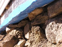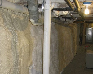 Foundation Assembly: Conditioned basement with 2-3” closed-cell spray foam insulation applied directly to field stone foundation walls and covered with FireFree 88® ignition barrier paint. A 12” high strip of 2” XPS as the slab perimeter thermal break also allows foundation walls to drain to the sub-slab drainage system. Trenches filled with gravel and drainage pipe connected to a sump manage bulk water below a new concrete basement floor slab, 6 mil poly, 2” XPS and continuous bed of gravel.
