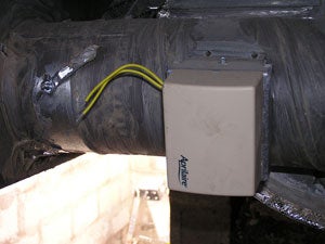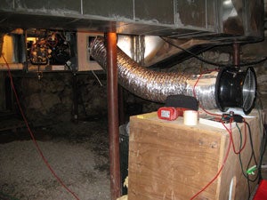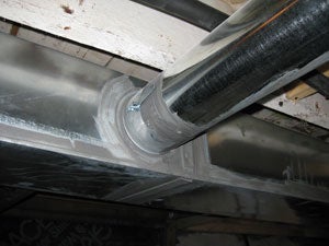 The total air distribution system leakage testing measured 285 cfm at 25 Pa. Testing found 50 cfm leakage to the outside. The total leakage measurement was higher than expected given that the HVAC installer had used mastic on joints and connections, and that duct pressurization was used to help volunteers and BSC staff locate and seal duct leakage. The fact that the distribution system had been reconfigured during the course of the project undoubtedly affected duct leakage.