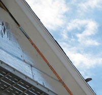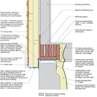 Design Challenge: Air Leakage Control Initial plans for this project called for air leakage control of the wall assembly to be accomplished by a carefully detailed housewrap layer applied over the existing sheathing after removal of the existing cladding. During the course of several protracted project delays, this housewrap layer became severely damaged. Rather than remove and re-apply a housewrap air barrier, BSC and HfHGL decided to implement the air barrier at the exterior face of insulating sheathing. BSC developed details to resolve complex air barrier transitions at the base of the wall, windows, mechanical penetrations, and at roof-wall transitions. Visual inspection as well as blower-door assisted air barrier remediation demonstrated that the air leakage control strategy is highly dependent upon workmanship, project schedule, and timing. While it certainly is possible to achieve effective air leakage control at the exterior face of insulating sheathing, it is likely that air leakage control systems implemented at the face of existing sheathing will be more readily feasible for retrofit situations. |