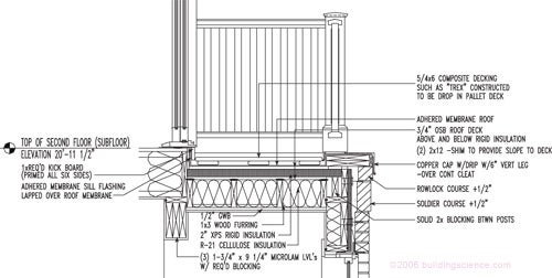 Balcony detail: Although the roof lines of the main structures are relatively straightforward, there are complex cladding, flashing, and air sealing details for the second story proches and the bump-out column bay on Unit 1. Achieving superior energy efficiency and durability with these details requires detailed drawings for follow-through during construction.
