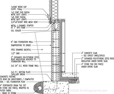 Foundation detail: Note the type and location of rigid insulation in terms of both thermal and moisture performance, the complete and continuous drainage details for bulk moisture and the air sealing details as the foundation meets the framing assemblies above.