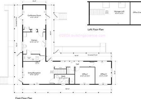 2. The HVAC system – Building a high-performance structure allows you to really fine tune or “right-size” your space heating and cooling unit, your fresh-air ventilation, and the ducts that deliver all three. Essential elements to the Administration Building include a variable-speed ECM air handler, a two-stage 13.25 SEER/8.95 HSPF heat pump unit, and a scheduled intermittent out-side air ventilation system that also provides mixing of all interior air. Mechanical ventilation, you say? You can’t build this tight and not purposefully introduce the outside air you need.