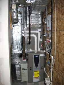 Heating and Cooling: 97.5% AFUE furnace with variable speed ECM blower installed in conditioned space paired with 9.5 HSPF/ 17 SEER heat pump.