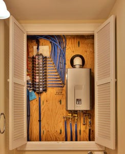 DHW:0.82 EF on-demand propane water heater with centrally located plumbing manifold.