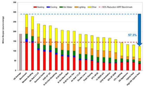 Estimated Annual Energy Savings: 57% energy use reduction as compared to the Building America benchmark; estimated $3,550 per year saviings