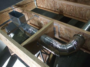 After completion, testing was done to determine if the house met BSC’s Building America Performance Criteria. The air leakage target was 2.5 in2 per 100 ft2 of enclosure area; the Live/Work Townhome easily met targets, at 1.5 in2 per 100 ft2. Total duct leakage was measured at 125 CFM at 25 Pa (8% of floor area), which is higher than desired, but expected in sheet metal systems. However, leakage to the exterior was below measurement limits, meaning that this ductwork leakage was to the interior, with minimal energy penalties.