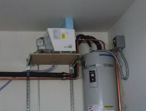 The remaining loads (domestic hot water, lighting, plug and appliance loads) were still very significant. The DHW load was reduced substantially by the use of a heat pump water heater located in the garage, as well as a drainwater heat recovery system, which captures second floor shower and sink drainwater heat, and uses it to preheat incoming mains water.